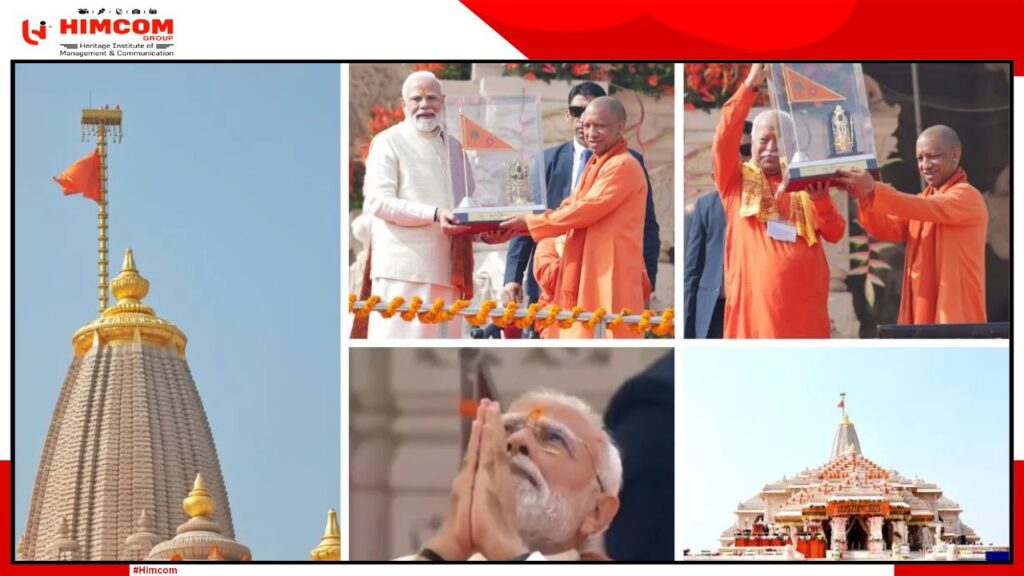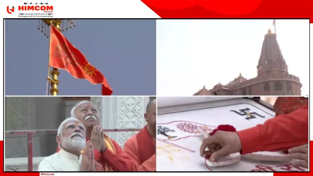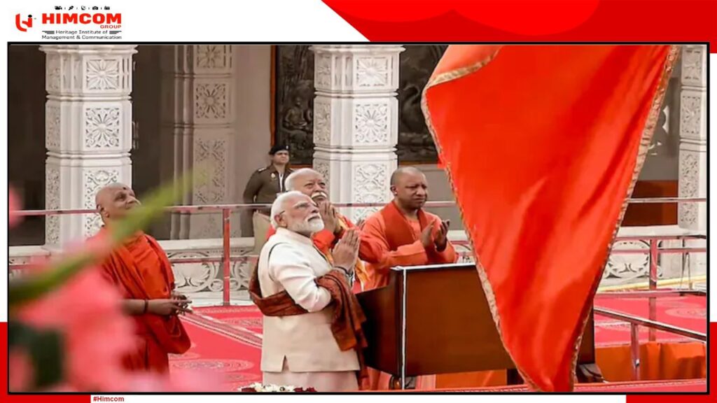 कार्यक्रम स्थल पर पीएम मोदी, मोहन भागवत और सीएम योगी हाथ जोड़े नमस्कार की मुद्रा में खड़े थे।मंत्रोच्चार पूर्ण होने के बाद पीएम मोदी ने एक मशीन को दाएं से बाएं की तरफ घुमाया, जिसके बाद धर्म ध्वजा खुद ही राम मंदिर के शिखर पर फहराया। ये अनोखी परंपरा चर्चा का विषय बना हुआ है।