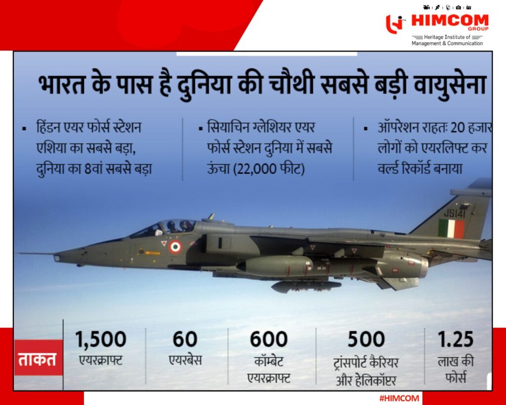 हमारी आज वायु सेना विश्व की चौथी सबसे शक्तिशाली सेना है इसकी ताकत लगभग 1,700 विमान, 60 एयरबेस, और 1.5 लाख से अधिक कर्मि है। भारत अब न सिर्फ अपने सीमाओं की रक्षा करता है, बल्कि अंतरराष्ट्रीय मानवीय मिशनों में भी योगदान देता है।